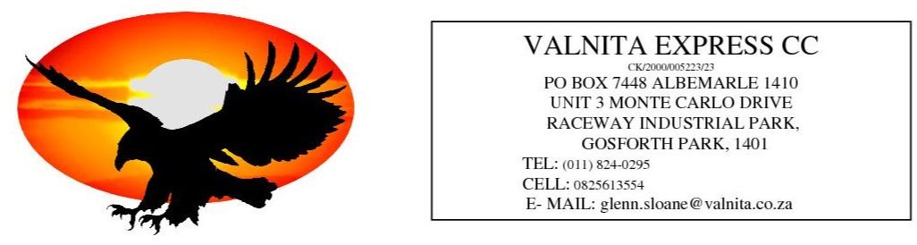 The company was registered on the 1st of December 1999, We started trading in January 2000. Valnita Express started as a two-man operation with the sole purpose to offer a courier service to the public that is reliable and efficient. With a selfless dedication and pure determination to offer the best customer service; we endured many trials growing up the business, after a few years the company was able to employ additional driver’s, currently the company employs 46 full time staff. We have managed to expand to the coastal regions as well as opened small goods delivery which we use motorcycles We believe our customers are always our priority; this is the belief that has led us to acquire new business continuously. We have been a proud sponsor of the Bluecoats and Tommy Harvey for the past 8 years